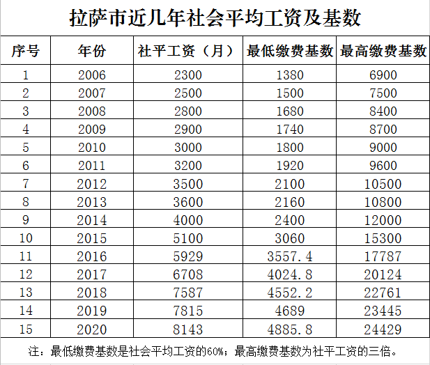 根據(jù)西藏自治區(qū)人社廳、西藏自治區(qū)財政廳、西藏自治區(qū)統(tǒng)計局《關(guān)于發(fā)布2020年上年度全區(qū)職工月平均工資的通知》(藏人社發(fā)〔2020〕82號)精神,2020年社會平均工資為8143元/月,新的繳費(fèi)基數(shù)上下限及繳費(fèi)標(biāo)準(zhǔn)從2020年1月1日起執(zhí)行。