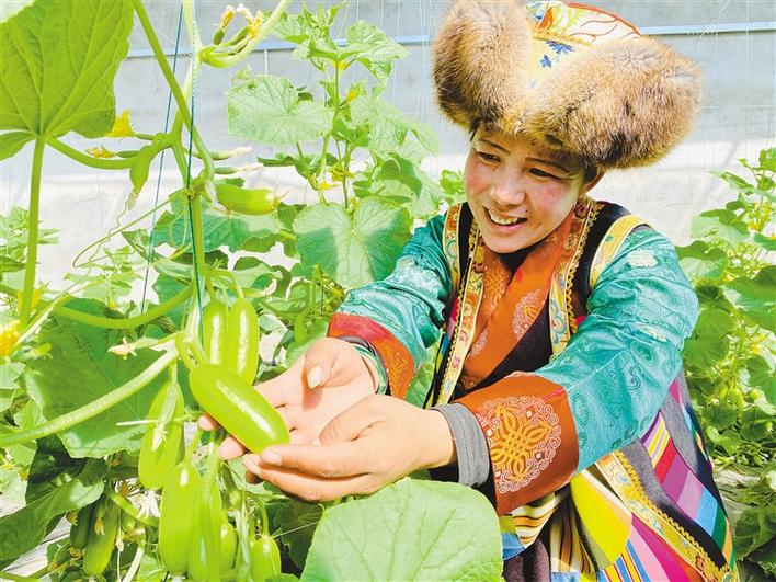 圖為山南市瓊結(jié)縣相達(dá)村村民次仁措姆在基地內(nèi)采摘拇指黃瓜。倫珠澤仁 記者 洛桑 攝