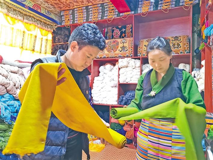 日喀則市仁布縣德吉林鎮(zhèn)德旦康薩傳統(tǒng)手工業(yè)農(nóng)牧民專(zhuān)業(yè)合作社負(fù)責(zé)人旦真正在查看產(chǎn)品質(zhì)量。記者 扎西頓珠 攝