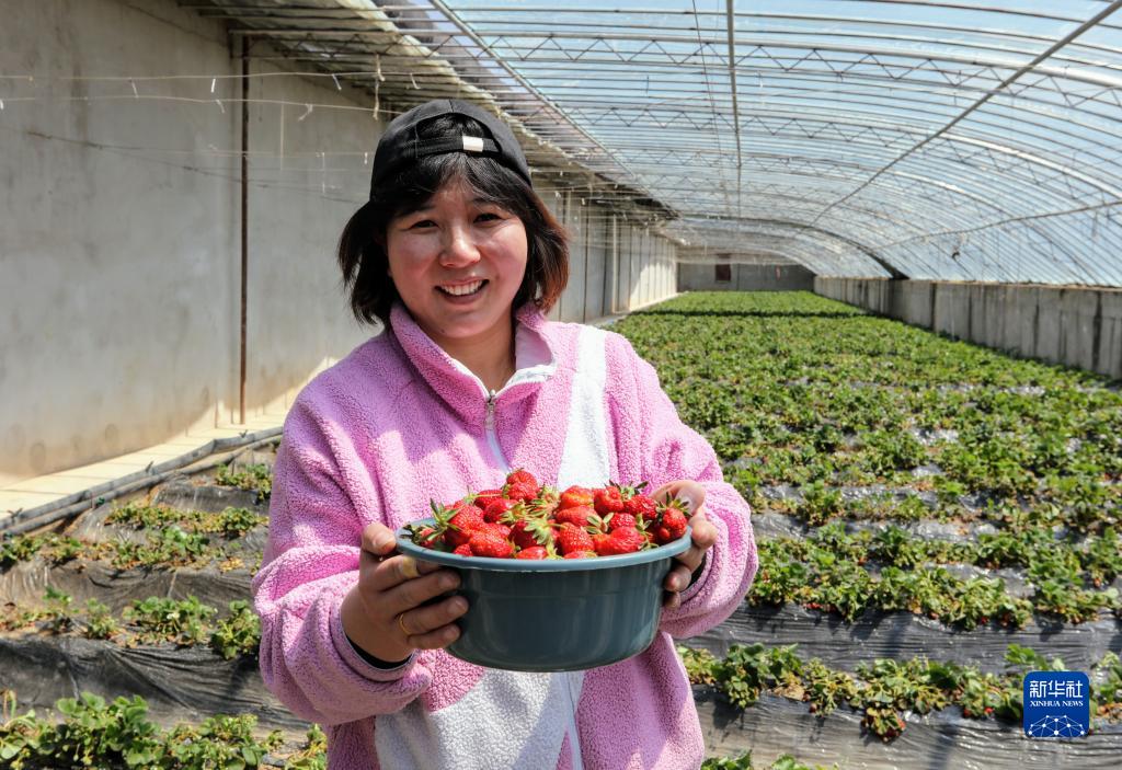 來自河南的農(nóng)民楊華麗在西藏阿里地區(qū)噶爾縣生態(tài)農(nóng)業(yè)產(chǎn)業(yè)園展示自己種出的草莓(2022年4月10日攝)。新華社記者 姜帆 攝