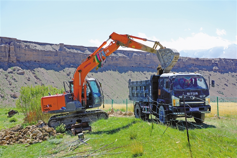 普蘭縣普蘭鎮(zhèn)仁貢村孔雀施工隊的機(jī)械車輛在施工,當(dāng)?shù)厝罕娫谄仗m縣普蘭鎮(zhèn)施工隊務(wù)工,一天可增收230元。記者 溫凱 攝
