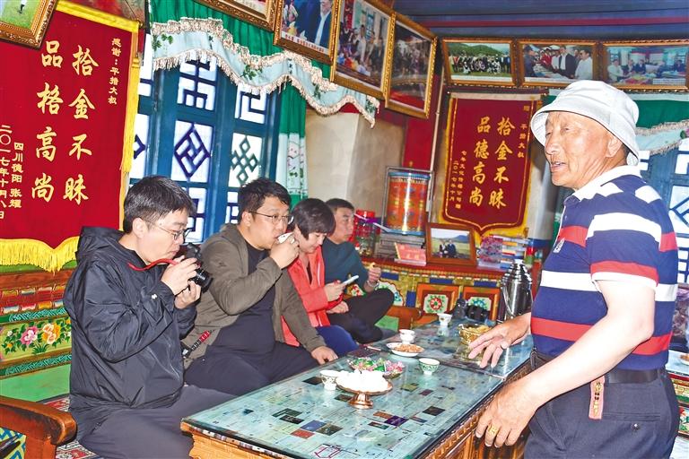 平措在家庭旅館內(nèi)招待北京來(lái)的游客。 記者 張猛 攝