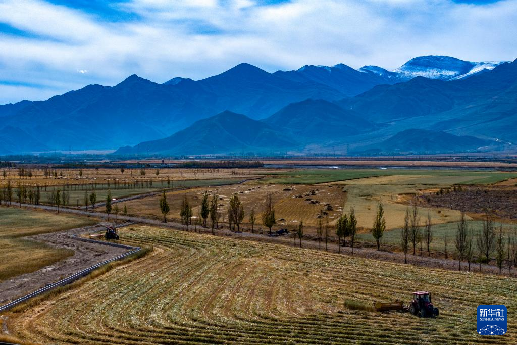 10月24日,村民駕駛農(nóng)機(jī)在拉薩市林周縣強(qiáng)嘎鄉(xiāng)曲嘎強(qiáng)村收割牧草(無人機(jī)照片)。新華社記者 姜帆 攝