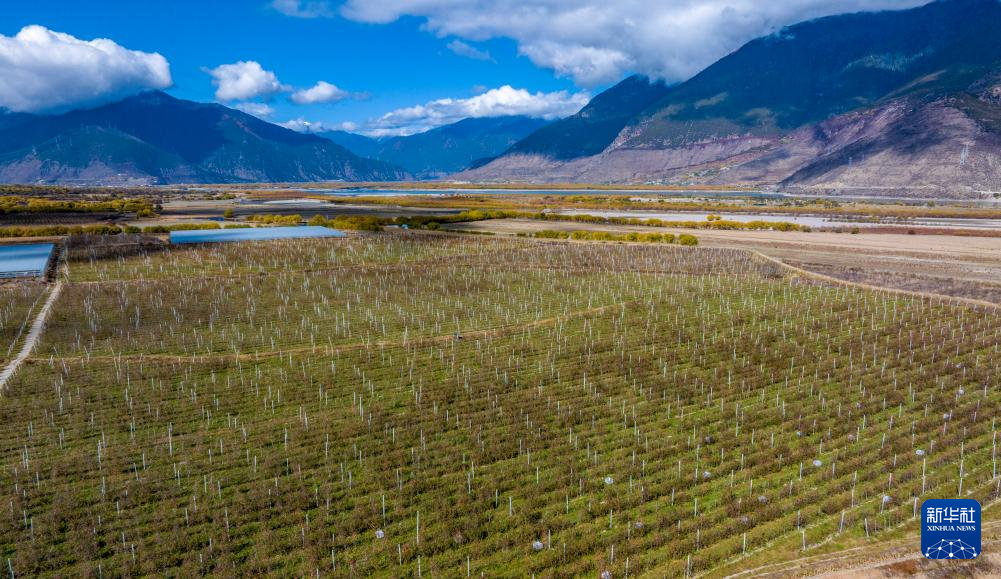 鳥瞰米林市羌納鄉(xiāng)西藏林芝現(xiàn)代蘋果標(biāo)準(zhǔn)化園區(qū)(無人機照片,11月13日攝)。新華社記者 姜帆 攝