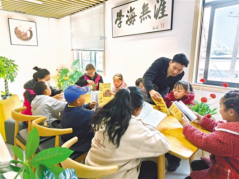 新時(shí)代文明實(shí)踐志愿服務(wù)隊(duì)成員在扎拉村農(nóng)家書(shū)屋輔導(dǎo)孩子閱讀書(shū)籍。