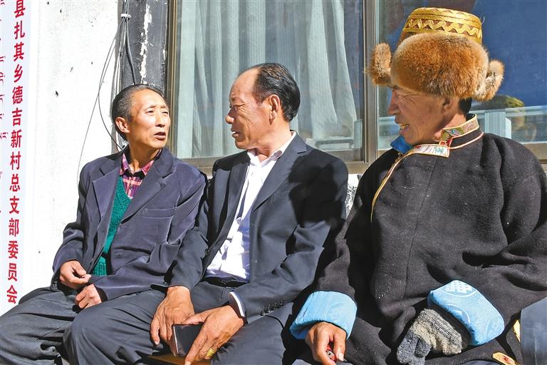 扎囊縣扎其鄉(xiāng)德吉新村,生活著藏族、漢族、土族等不同民族790余名群眾,該村先后榮獲縣級民族團結(jié)進步模范集體、山南市民族團結(jié)進步模范單位、自治區(qū)民族團結(jié)進步模范村(居)等稱號,是山南市遠近聞名的“團結(jié)村”。 圖為在德吉新村村委會大院內(nèi),祖籍青海,身著藏裝的村民張積成(右一),與同村不同民族的群眾一起交談。 記者 丹增平措 攝