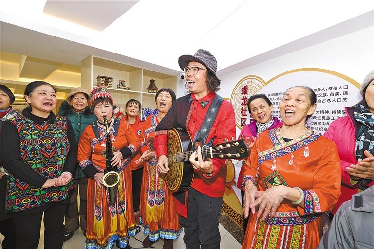 “蟠龍社區(qū)生活著漢族、壯族、瑤族等15個民族的同胞,少數民族人口約占社區(qū)總人口的1/3?!斌待埳鐓^(qū)黨委副書記許玉君介紹說,社區(qū)結合多民族“嵌入式”居住的特點,創(chuàng)新踐行“136”工作機制,即圍繞鑄牢中華民族共同體意識這條主線,通過加強黨的領導、織牢精神紐帶、用好治理平臺“三個抓手”,積極創(chuàng)造各民族共居共學、共建共享、共事共樂的“六共”條件,讓各族群眾像石榴籽一樣緊緊抱在一起?!拔沂菨h族,會做壯族的特色菜,我愛人是仫佬族,漢字書法練得有模有樣?!斌待埳鐓^(qū)藝術團骨干何繼榮老人說。