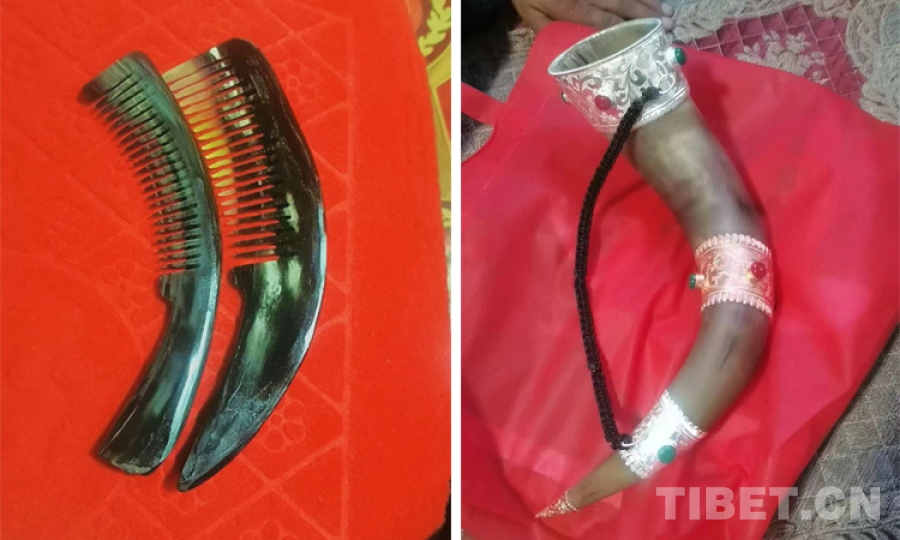 圖為麻木卓瑪管理站站長洛達(dá)用牦牛角制作的梳子和酒器?。暹_(dá)供圖)