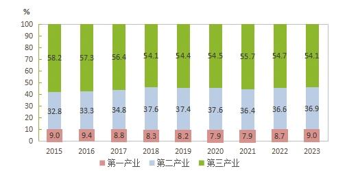 圖2 2015-2023年三次產業(yè)增加值占地區(qū)生產總值比重