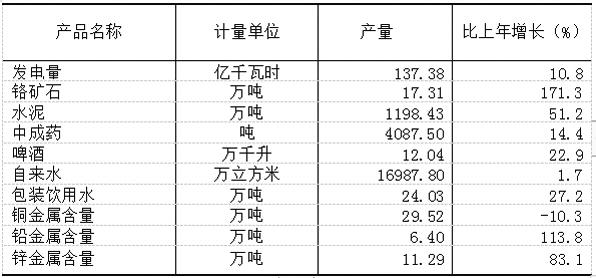 全年規(guī)模以上工業(yè)企業(yè)水泥產量1198.43萬噸,比上年增長51.2%;鉻礦石17.31萬噸,增長171.3%;中成藥(藏醫(yī)藥)4087.50噸,增長14.4%;自來水16987.80萬立方米,增長1.7%;發(fā)電量137.38億千瓦時,增長10.8%;啤酒12.04萬千升,增長22.9%;包裝飲用水24.03萬噸,增長27.2%。
