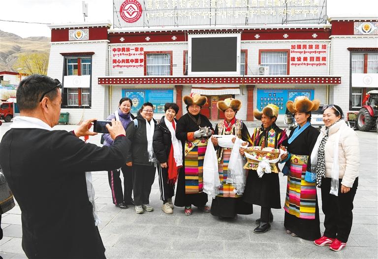 圖為游客在扎西曲登社區(qū)合照留念。 記者 旦增蘭澤 洛桑 唐斌 攝