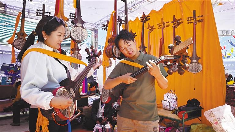 圖為在日喀則高原農(nóng)特產(chǎn)品及尼泊爾特色產(chǎn)品展示展銷活動上,商家向顧客介紹扎念琴。