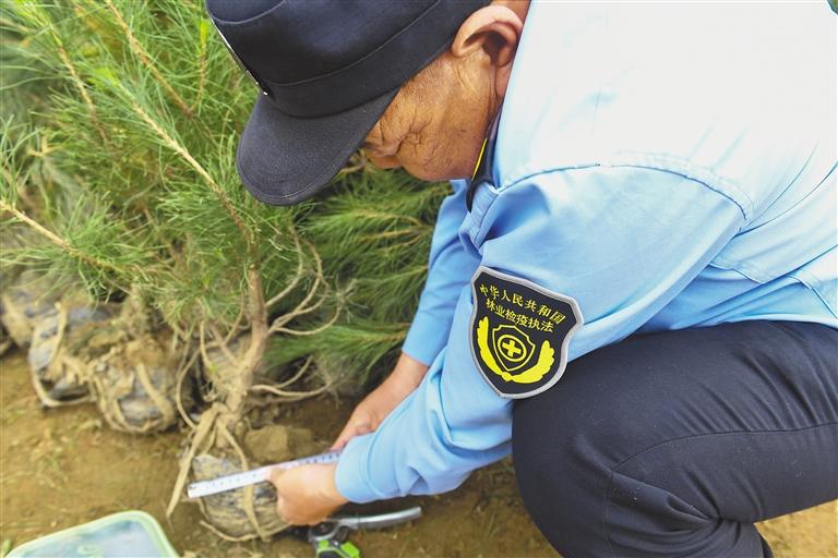 在拉薩南北山綠化工程2024年度鞏固提升(貢嘎機(jī)場周邊山體)工程項(xiàng)目上,林業(yè)檢疫執(zhí)法工作人員在檢查樹苗根部土球是否達(dá)標(biāo)。 新華社記者 晉美多吉 攝