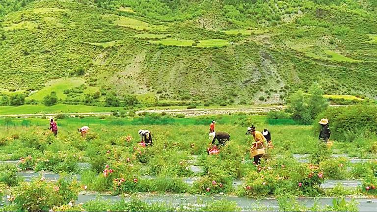 桑多鄉(xiāng)桑多村群眾在村集體經(jīng)濟(jì)產(chǎn)業(yè)——云朵玫瑰基地采摘作業(yè)。記者 平措郎加 攝