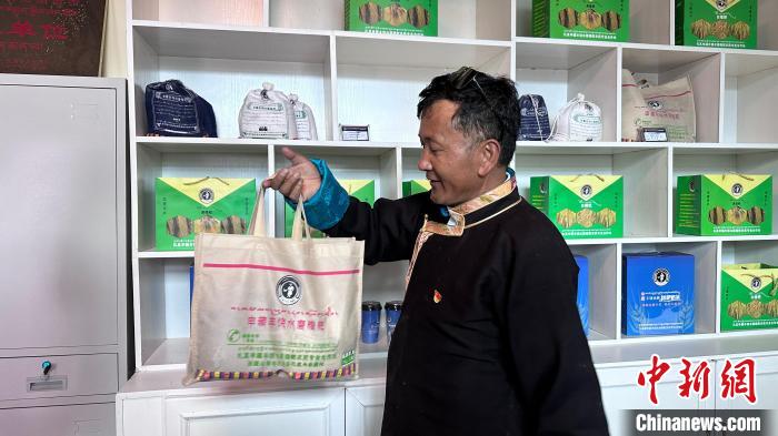 圖為申藏村黨支部書記旺扎正在向記者展示糌粑產(chǎn)品。澤塔雍措 攝
