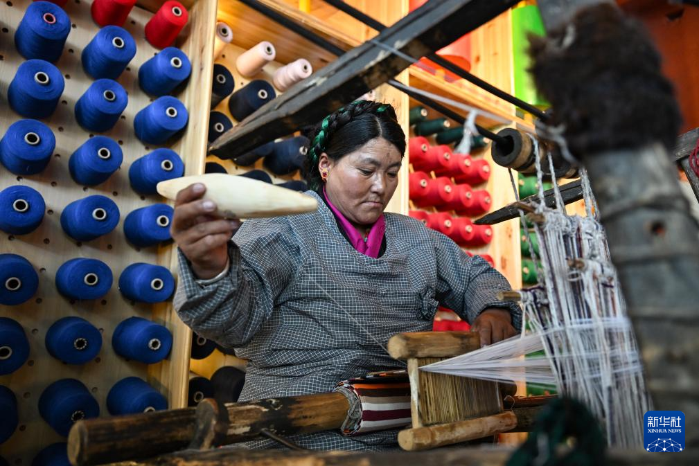 氆氌是藏族群眾用來制作藏式衣物的毛織品,其工藝迄今已有上千年歷史。在上海援藏幫扶下,這項傳統(tǒng)技藝如今已成為當(dāng)?shù)亍鞍⒓选保ú卣Z意為“大姐”)們的致富新途徑,煥發(fā)出新的生機。