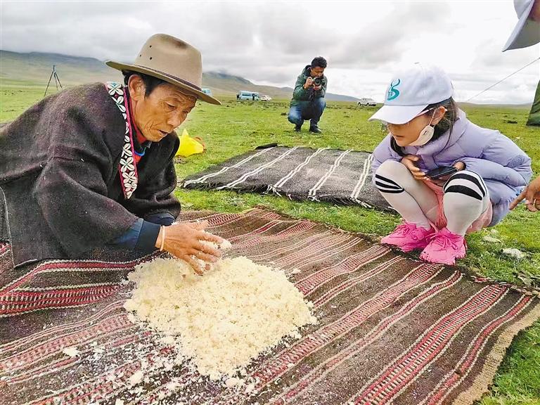 圖為游客在瑪如村觀看當?shù)啬撩裰谱髂淘S浾?丹增平措 攝