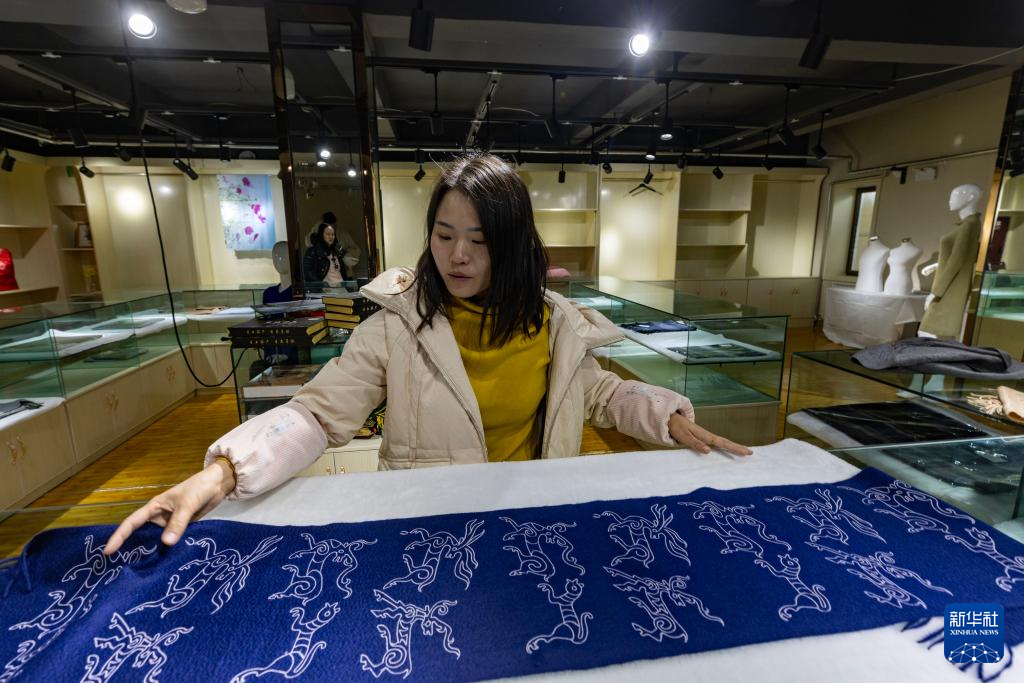 日土縣白山羊絨產(chǎn)業(yè)展示中心的工作人員在展示印有日土巖畫圖案的“指環(huán)披肩”(11月16日攝)。新華社記者 姜帆 攝