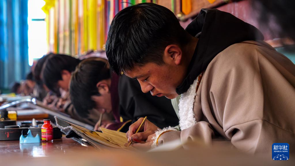 11月22日,昌都市丁青縣擁忠文化藝術中心非遺扶貧就業(yè)工坊學員在練習藏文書法。新華社記者 普布次仁 攝