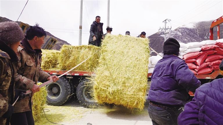 3月18日清晨,細(xì)碎的雪花如柳絮般輕柔飄落,墨竹工卡縣門(mén)巴鄉(xiāng)覆上了一層銀裝。門(mén)巴鄉(xiāng)巴爾卡村委會(huì)的院子里一片熱火朝天的景象,一袋袋飼草料和化肥整整齊齊地堆放在院子里,有的騎著摩托車(chē),有的開(kāi)著拖拉機(jī),大家的臉上都洋溢著幸福的笑容,滿(mǎn)心期待著物資發(fā)放。