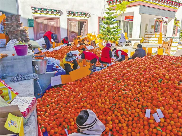 在芒康縣木許鄉(xiāng),一箱箱“康巴蜜桔”被村民精心打包,發(fā)往各地銷售。僅2024年,全鄉(xiāng)通過線下銷售累計(jì)賣出蜜桔14萬斤,成為了當(dāng)?shù)厝罕娫鍪罩赂坏摹敖鸸印薄?/p>