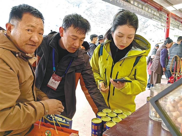圖為嘉黎縣尼屋鄉(xiāng)桃花節(jié)期間,游客爭相購買特色農產品。記者 趙書彬 攝