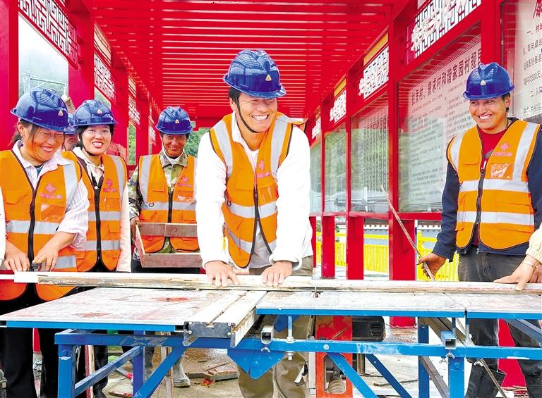 圖為村莊基礎(chǔ)設(shè)施提升項(xiàng)目現(xiàn)場,曾求村村民在加工木材。記者 旦增蘭澤 通訊員 朗玲 攝