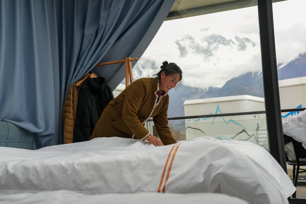 2025年4月4日,林芝索松村一家民宿的服務員在整理房間。近年來,林芝在生態(tài)保護與旅游發(fā)展的良性互動中,探索出“賞花+民宿”“賞花+文創(chuàng)”等復合經營模式。2025年4月4日至4月6日期間,林芝市累計接待游客20.86萬人次,同比增長20.58%;實現(xiàn)旅游收入1.5億元,同比增長37.62%。