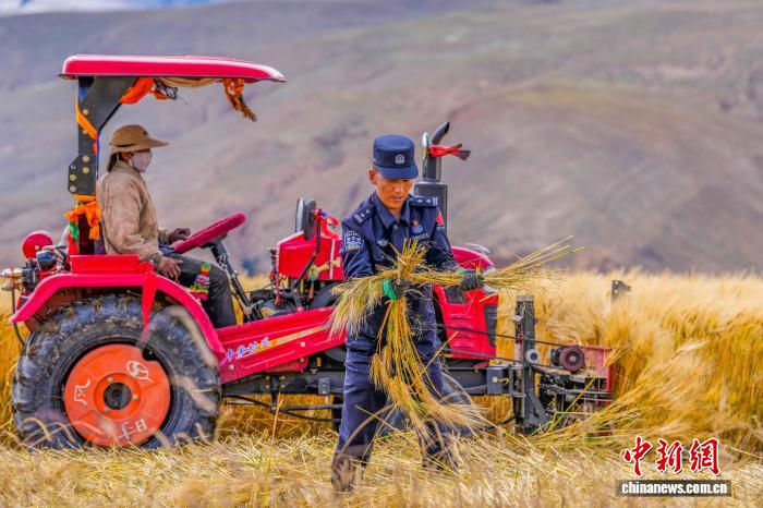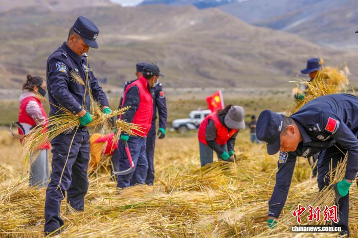 金秋時節(jié),青稞飄香。23日,西藏日喀則邊境管理支隊涅如麥邊境派出所民警們深入田間,在廣袤的田野上,與農(nóng)牧民一同俯身勞作,揮鐮收割,搶收青稞。