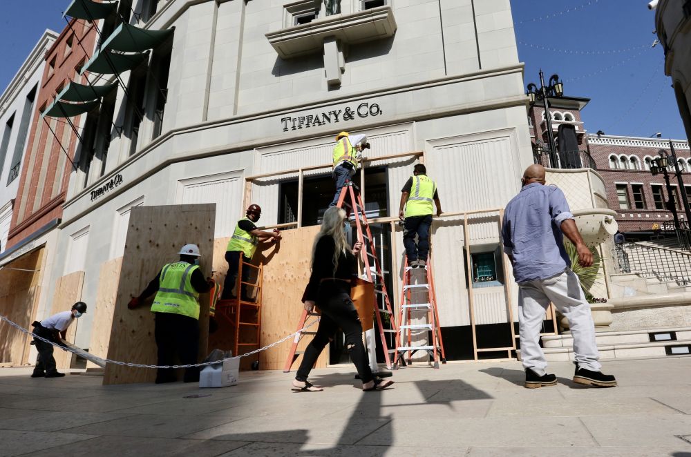 2020年11月2日,美國(guó)洛杉磯縣貝弗利山市商業(yè)區(qū)的商家將店鋪門(mén)窗封上。為應(yīng)對(duì)當(dāng)時(shí)美國(guó)大選可能出現(xiàn)的抗議或騷亂,貝弗利山市不少商業(yè)區(qū)加強(qiáng)防護(hù)和安保。 新華社發(fā)