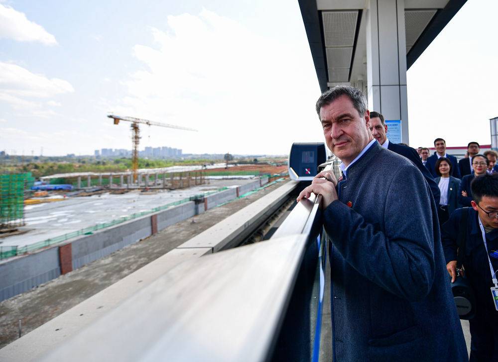 德國(guó)巴伐利亞州州長(zhǎng)索德?tīng)栐谒拇▍⒂^中德合作的磁懸浮成都試驗(yàn)線。新華社記者張超群攝