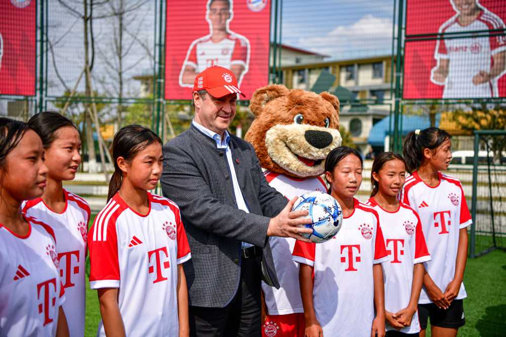 德國(guó)巴伐利亞州州長(zhǎng)索德?tīng)枺ㄗ笏模┰谖挥诔啥际形浜顓^(qū)的阿迪達(dá)斯20號(hào)體育公園觀摩了一場(chǎng)中國(guó)少年女子足球隊(duì)的訓(xùn)練賽。新華社記者張超群攝