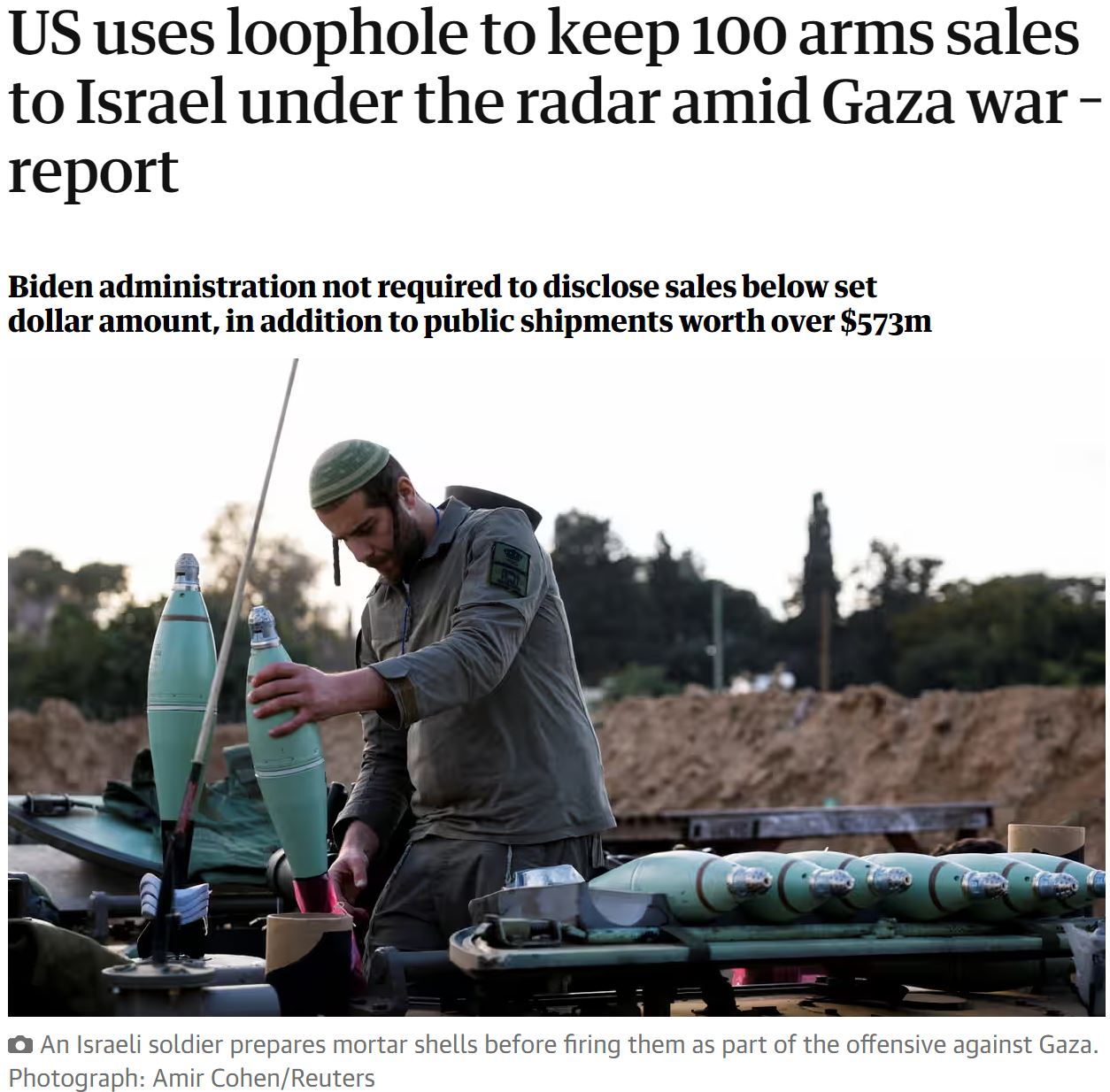 而據(jù)美國現(xiàn)任和前任官員此前披露,本輪巴以沖突爆發(fā)后,拜登政府已秘密通過100多筆單獨(dú)軍售計(jì)劃,向以色列輸送了大量武器。