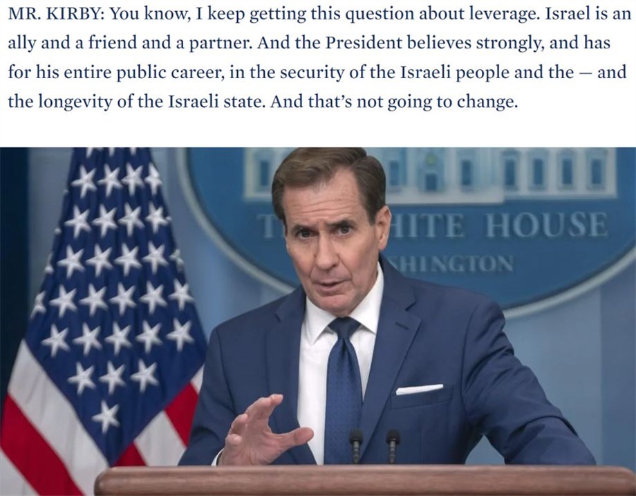 白宮國家安全委員會戰(zhàn)略溝通協(xié)調(diào)員柯比當(dāng)天在記者會上被反復(fù)追問“美國是否會切斷對以色列的武器供應(yīng)”時一味回避躲閃,但在回答美以關(guān)系問題時卻斬釘截鐵。