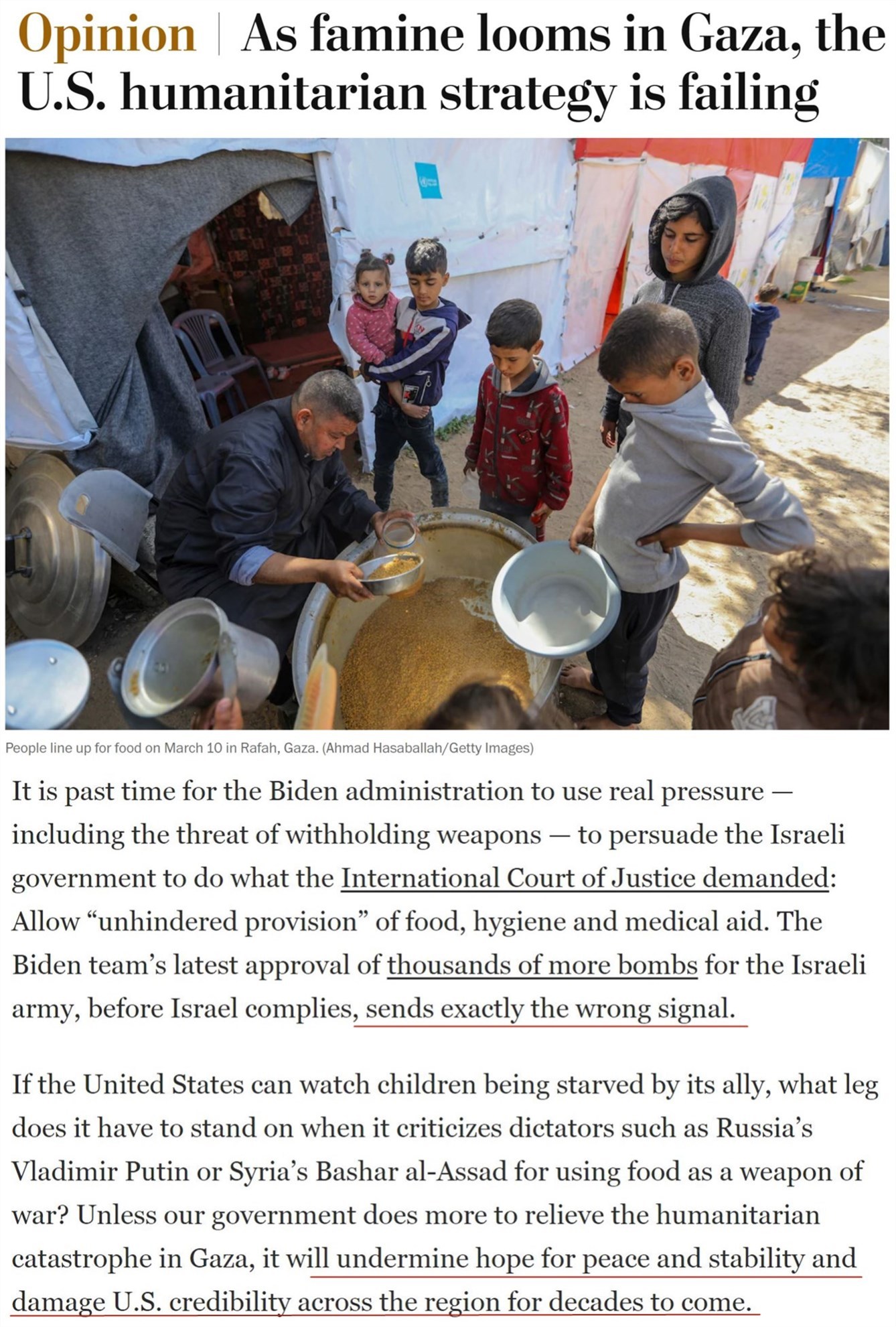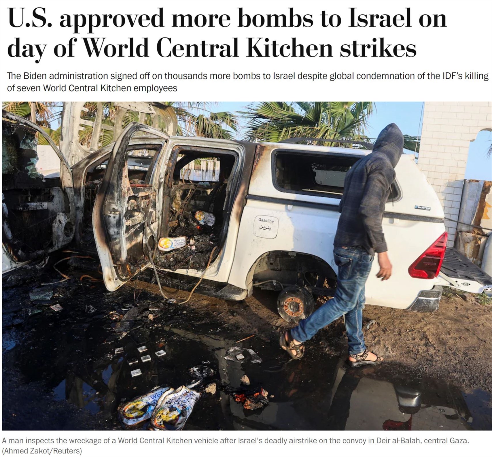 文章認(rèn)為,拜登政府早就應(yīng)該利用真正的壓力——包括威脅中斷武器供應(yīng)——來迫使以色列政府允許外界向加沙“不受阻礙地提供”食品和醫(yī)療援助。但相反,拜登團(tuán)隊(duì)最近卻批準(zhǔn)再向以軍提供數(shù)千枚炸彈,“這發(fā)出了完全錯誤的信號”。