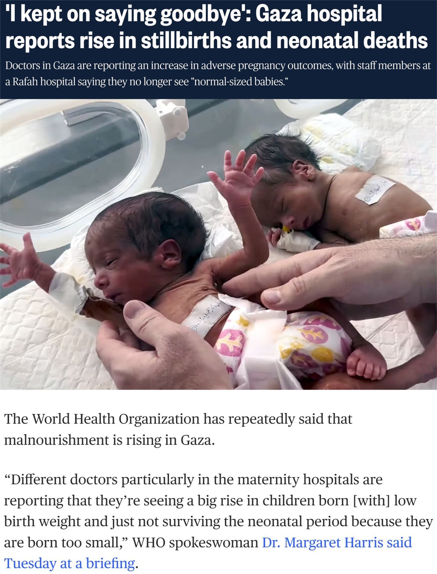 世界衛(wèi)生組織日前警告,加沙新生兒的死亡率正在直線上升。此外,還有大量嬰兒的體重達(dá)不到正常標(biāo)準(zhǔn),導(dǎo)致他們過早夭折。