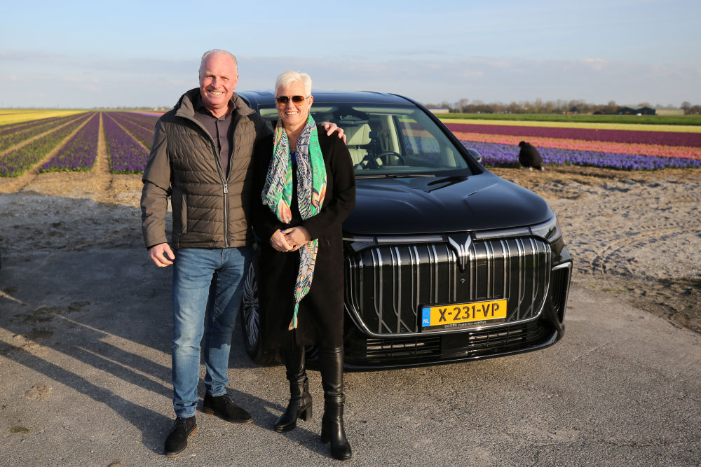 3月25日,荷蘭消費者埃里克·贊德貝亨和他的妻子埃倫在嵐圖汽車前合影。新華社記者趙丁喆攝