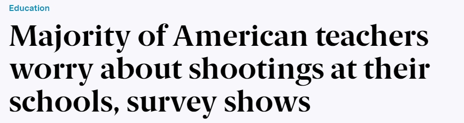 美國(guó)獨(dú)立新聞媒體The 19th 網(wǎng)站11日?qǐng)?bào)道稱(chēng),根據(jù)皮尤研究中心一項(xiàng)新的調(diào)查,絕大多數(shù)美國(guó)K-12公立學(xué)校的教師在一定程度上擔(dān)心學(xué)??赡軙?huì)發(fā)生槍擊事件。并且,多數(shù)教育工作者贊成對(duì)學(xué)生們進(jìn)行更多心理健康篩查和治療并反對(duì)教職工配槍上班。