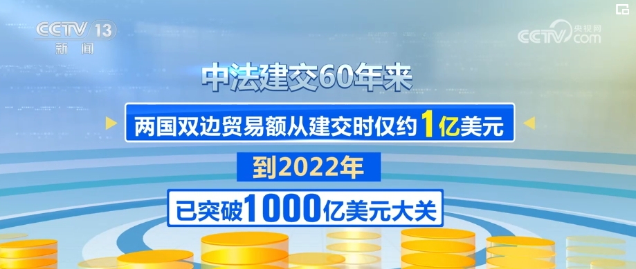 中法建交60年來,兩國雙邊貿(mào)易額從建交時僅約1億美元,到2022年已突破1000億美元大關(guān)。如今,法國是中國在歐盟內(nèi)第三大貿(mào)易伙伴和第三大實際投資來源國,中國則是法國在亞洲第一大貿(mào)易伙伴。