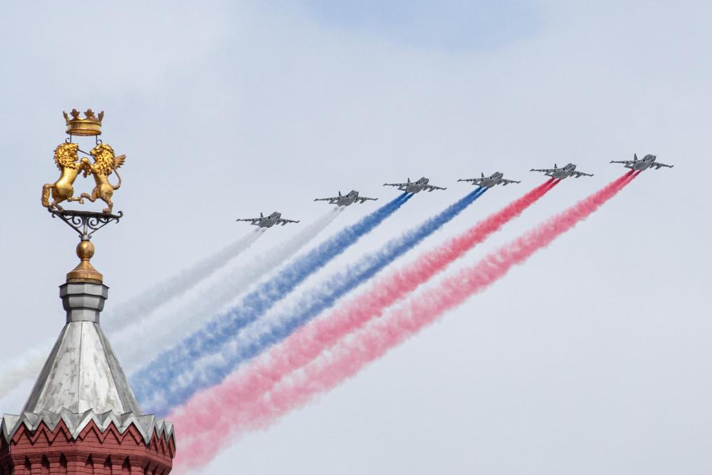 5月9日,在俄羅斯首都莫斯科,蘇-25攻擊機(jī)編隊在紅場上空飛過。新華社記者白雪騏攝