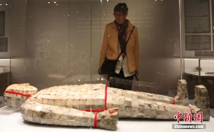 在匈牙利古都塞克什白堡舉行的“不朽的玉甲—中國漢代文物精品展”,共展出百余件玉器、漆器、陶器、青銅器、印章、石刻、錢幣等漢代文物,將漢代政治經(jīng)濟(jì)、社會生活、文化藝術(shù)和禮儀信仰逐一呈現(xiàn)。圖為當(dāng)?shù)貢r間5月7日,一名觀眾駐足細(xì)觀徐州博物館鎮(zhèn)館之寶西漢金縷玉衣。中新社記者 德永健 攝
