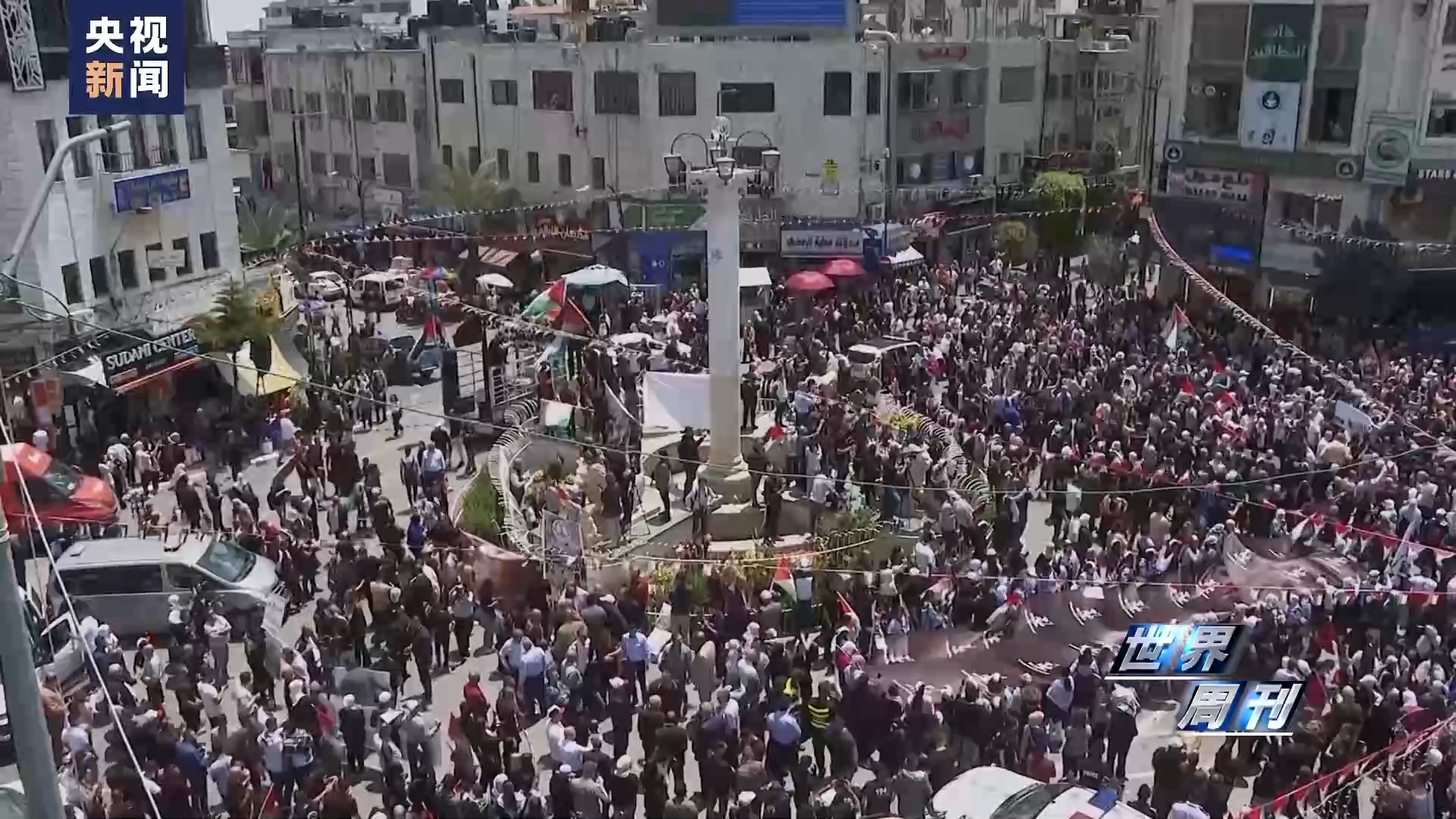5月15日當(dāng)天,約旦河西岸城市拉姆安拉,數(shù)千名民眾參與游行,他們高舉象征巴勒斯坦人民回歸權(quán)的鑰匙和象征沾滿鮮血的援助物資的道具,高呼口號(hào),要求結(jié)束以色列占領(lǐng)以及巴勒斯坦人回歸故土。