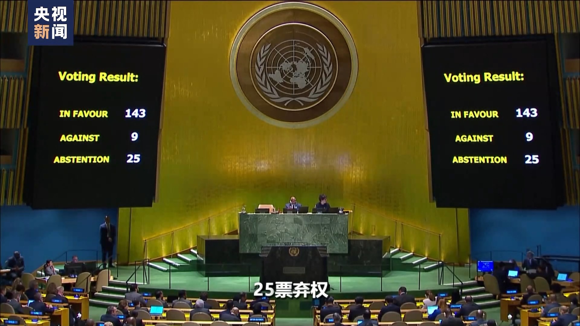 聯(lián)合國(guó)大會(huì)主席 丹尼斯·弗朗西斯:表決結(jié)果如下:143票贊成,9票反對(duì),25票棄權(quán)。