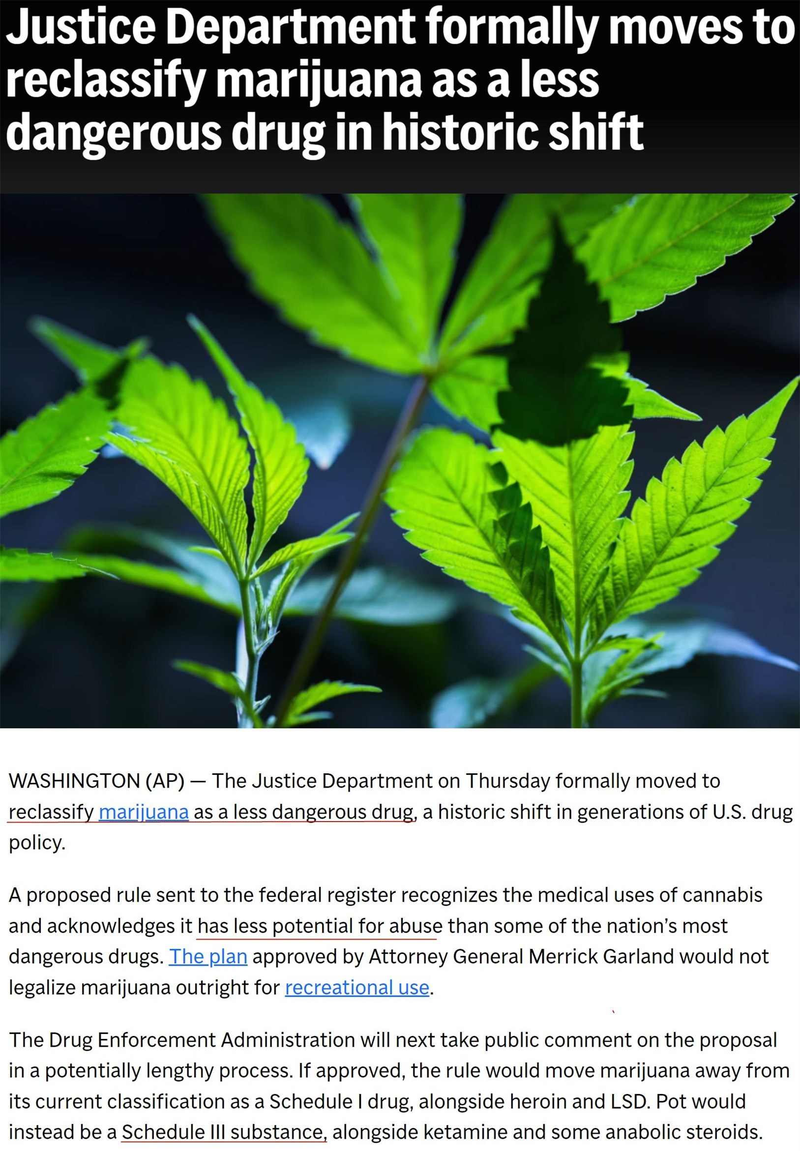 如果經(jīng)過60天的公眾意見征詢期后最終獲批,新規(guī)則雖然不會在聯(lián)邦層面將大麻完全合法化,但會將其移出《美國聯(lián)邦管制物質(zhì)法案》中列管海洛因等最危險毒品的“附表一”,轉(zhuǎn)而歸入列管氯胺酮和類固醇等危險性較低藥物的“附表三”。