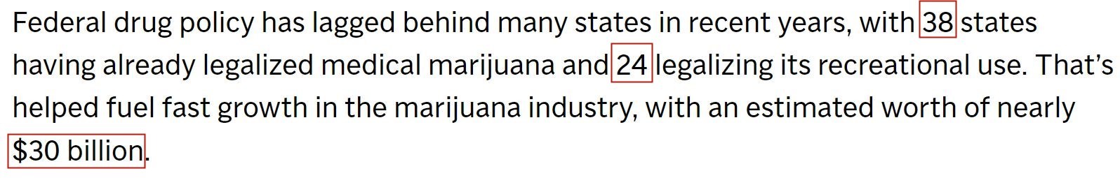 而在美國,目前已有38個州(37個州和華盛頓特區(qū))將醫(yī)用大麻合法化,24個州(23個州和華盛頓特區(qū))將娛樂性大麻合法化。