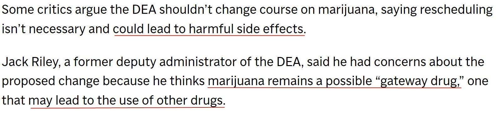 美國禁毒署前副署長杰克·萊利對擬議中的規(guī)則更改感到擔憂。他認為,大麻仍是一種“入門毒品”,可能導致對其他毒品的使用。