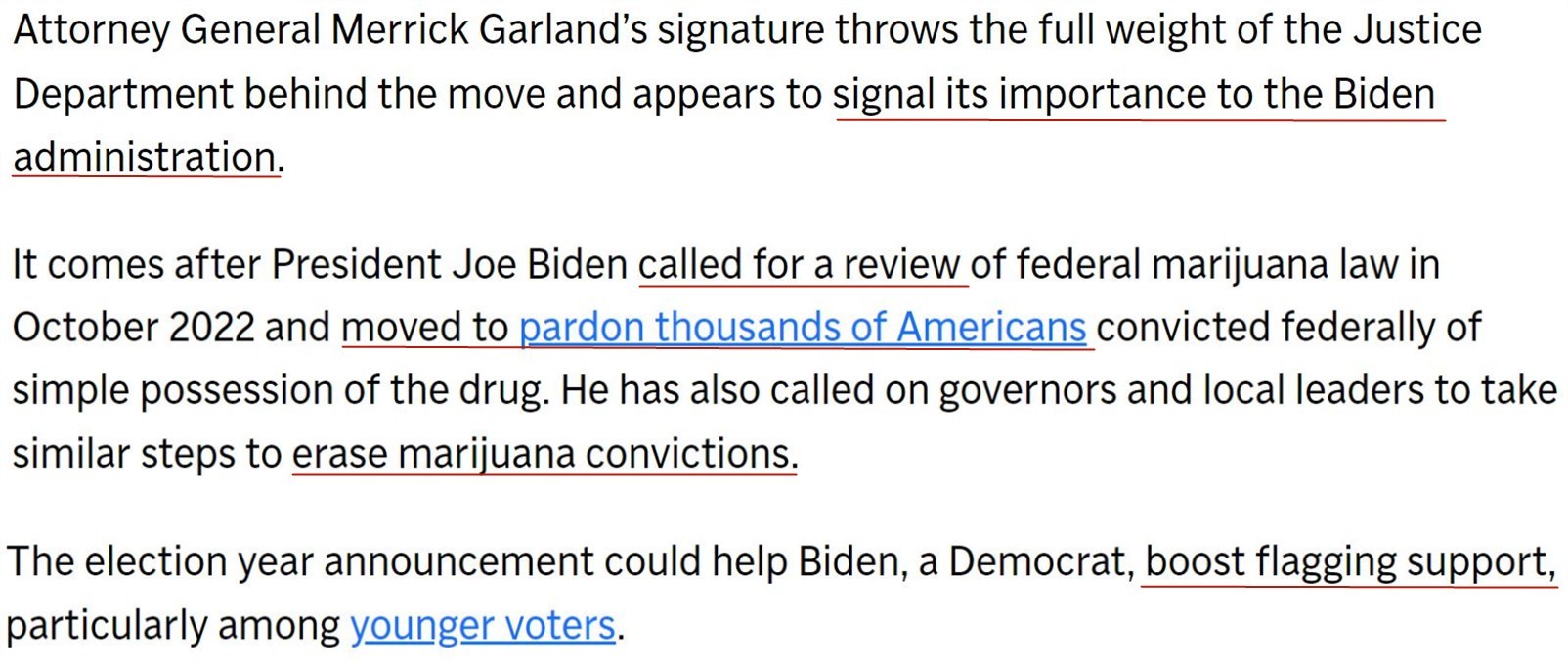 美聯(lián)社分析指出,美司法部對修改大麻分類的全力支持,表明了此舉對拜登政府的重要性。拜登在大選前夕推動大麻去罪化,就是為了吸引年輕選民的支持。