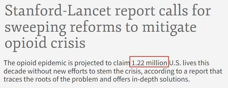 根據(jù)美國斯坦福大學和英國《柳葉刀》雜志共同進行的一項研究,如果美國不采取遏制措施,本世紀20年代將有約122萬美國人死于過量使用阿片類藥物,位列世界第一。