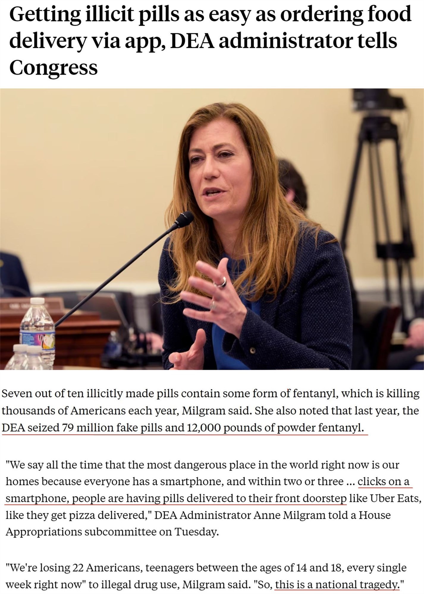 美國禁毒署署長安妮·米爾格拉姆本月早些時候告訴國會:“現(xiàn)在世界上最危險的地方就是我們的家,因為每個人都有智能手機,只要用手指點上兩三下,就能像在外賣平臺點比薩一樣,在家門口收到非法藥丸?!?/p>