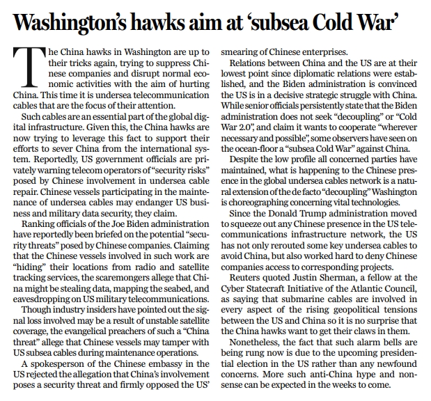 有報道稱,拜登政府的高級官員們已聽取了有關(guān)簡報,稱中國企業(yè)在此領(lǐng)域的參與會有潛在的“安全威脅”,參與相關(guān)作業(yè)的中國船只“似乎向無線電和衛(wèi)星跟蹤服務隱瞞了位置”,危言聳聽者們更是聲稱中國有可能借此竊取數(shù)據(jù),繪制海底地圖,并竊聽美國軍事通訊。